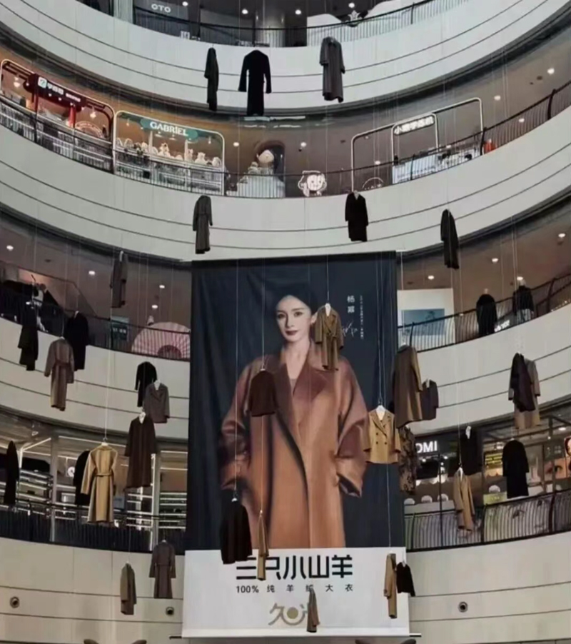 圖中可以清楚看到數(shù)十件長(zhǎng)大衣高低錯(cuò)落地懸于中庭,中間襯著品牌代言人楊冪的巨幅海報(bào),讓不少消費(fèi)者一進(jìn)門就感到“氣氛詭異,有點(diǎn)嚇人”,甚至有網(wǎng)友戲稱這是“冪級(jí)恐懼癥”。
